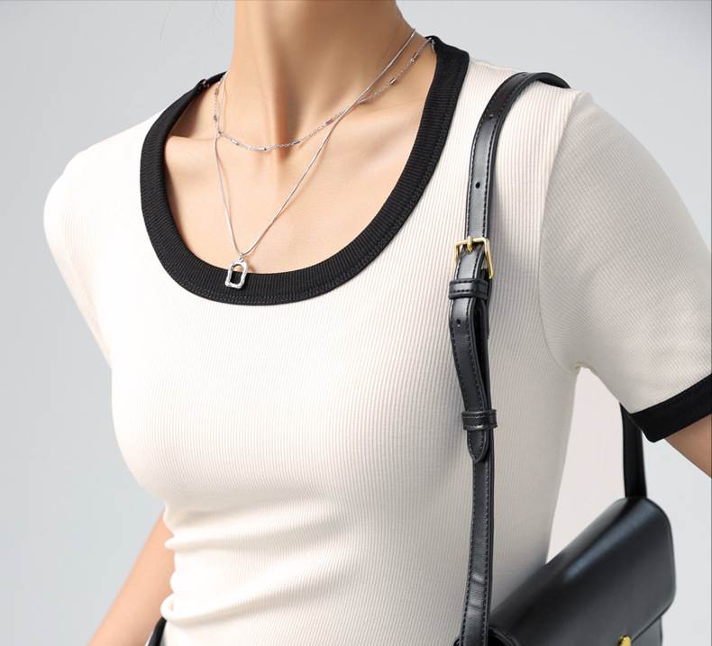 > 夏季撞色大圆领正肩短袖t恤女ins潮仿纯棉法式风女装打底衫上衣